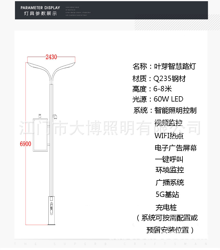 葉芽款智慧路燈廠家5G充電樁廣告屏監(jiān)控多功能智能庭院燈